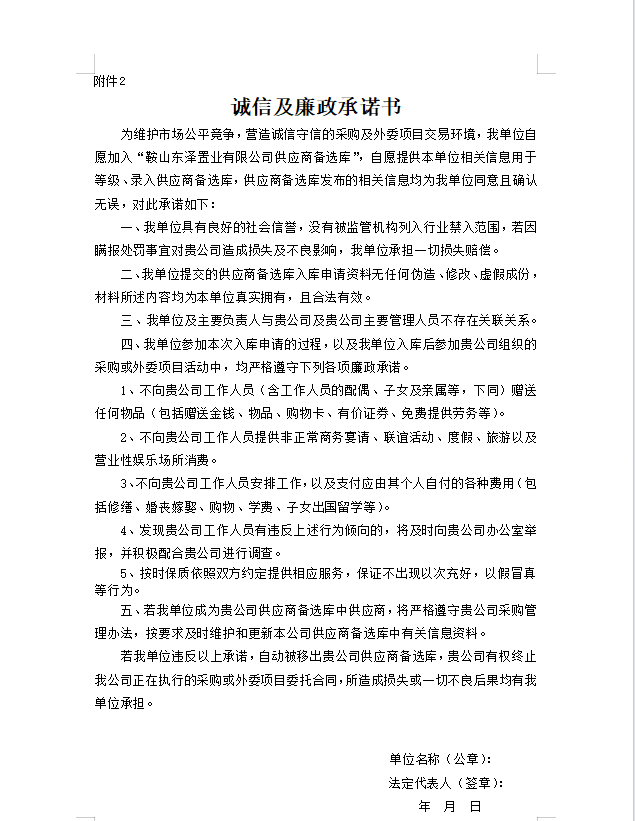 1.請(qǐng)有意向的企業(yè)按要求填寫(xiě)《供應(yīng)商入庫(kù)登記備案信息表》(見(jiàn)附件1)和《供應(yīng)商誠(chéng)信承諾書(shū)》(見(jiàn)附件2)。請(qǐng)將填寫(xiě)完畢并加蓋公章的上述資料掃描件,以及營(yíng)業(yè)執(zhí)照的掃描件,發(fā)送至指定郵箱asdc2017@163.com。同時(shí),企業(yè)也可選擇將蓋章的紙質(zhì)版資料和營(yíng)業(yè)執(zhí)照復(fù)印件(同樣需加蓋公章)送至鞍山市鐵東區(qū)建國(guó)大道21號(hào)206辦公室。如有任何疑問(wèn)或需要協(xié)助,請(qǐng)撥打聯(lián)系電話:15141215535。